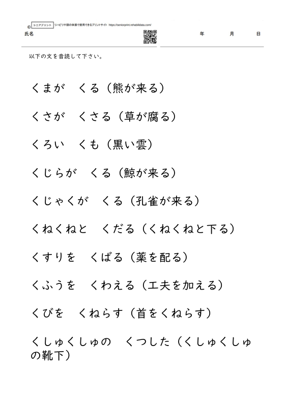 構音訓練のプリント 音読 2語文の音読課題 「く」 4枚【構音訓練のためのプリント教材】 X Facebook LINE Pinterest コピー 2026.03.30 2語文の音読課題 「く」 4枚【構音訓練のためのプリント教材】 全てのプリントをダウンロードするにはプレミアム会員登録が必要です。 →プレミアム会員について ←
